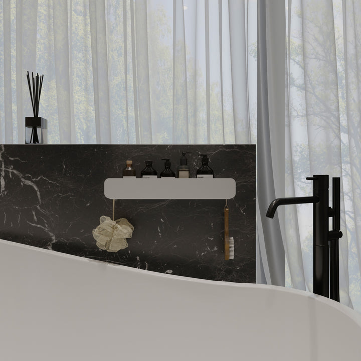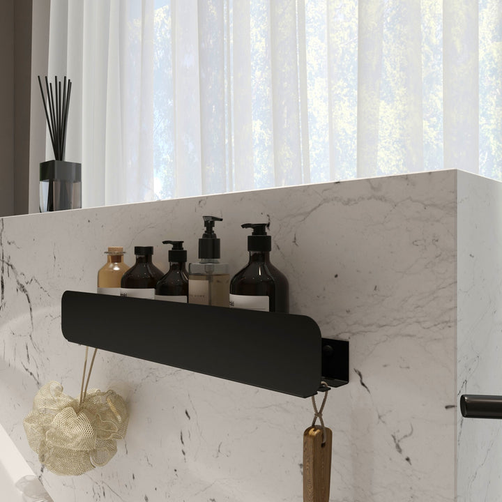 • Superficie de almacenamiento amplia: Su plataforma alargada ofrece espacio generoso para colocar productos de aseo como jabones, champús y más, manteniendo el orden en el baño.