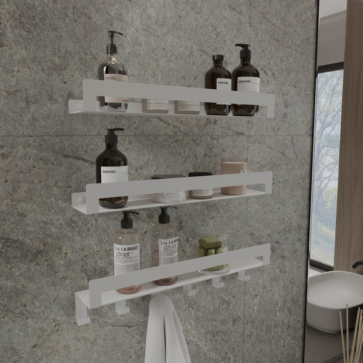 Este set de tres estantes de pared para baño ofrece una solución versátil y elegante para mantener tu espacio organizado. Dos estantes son ideales para colocar productos de higiene o decoración, y el tercero incorpora 6 ganchos integrados, perfectos para colgar accesorios como cepillos, esponjas o toallas pequeñas.