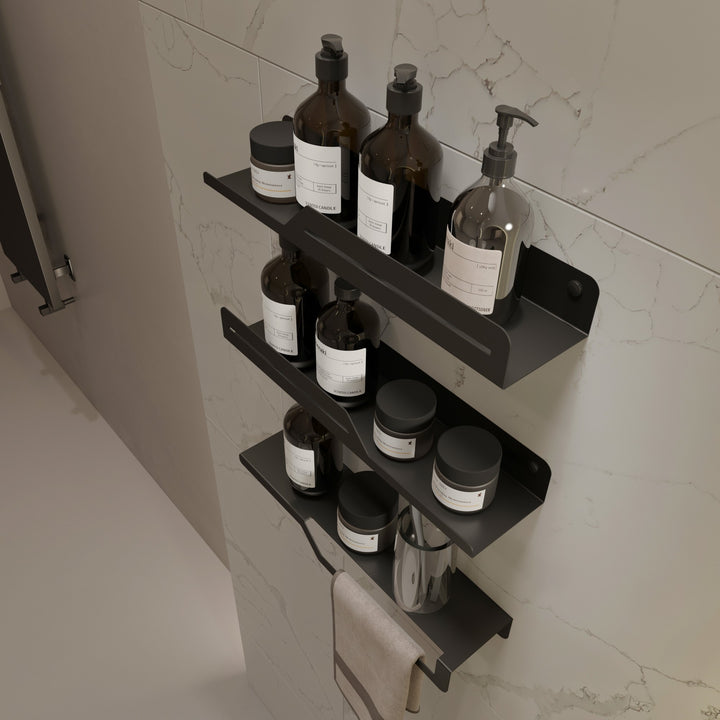 Este set de tres estantes de baño con soporte para toalla es la elección ideal para quienes buscan practicidad y estilo. Su diseño funcional y estética moderna los convierten en un complemento decorativo y útil que realzará cualquier baño. Perfecto para organizar productos, exhibir objetos decorativos o simplemente mantener tu espacio limpio y elegante.