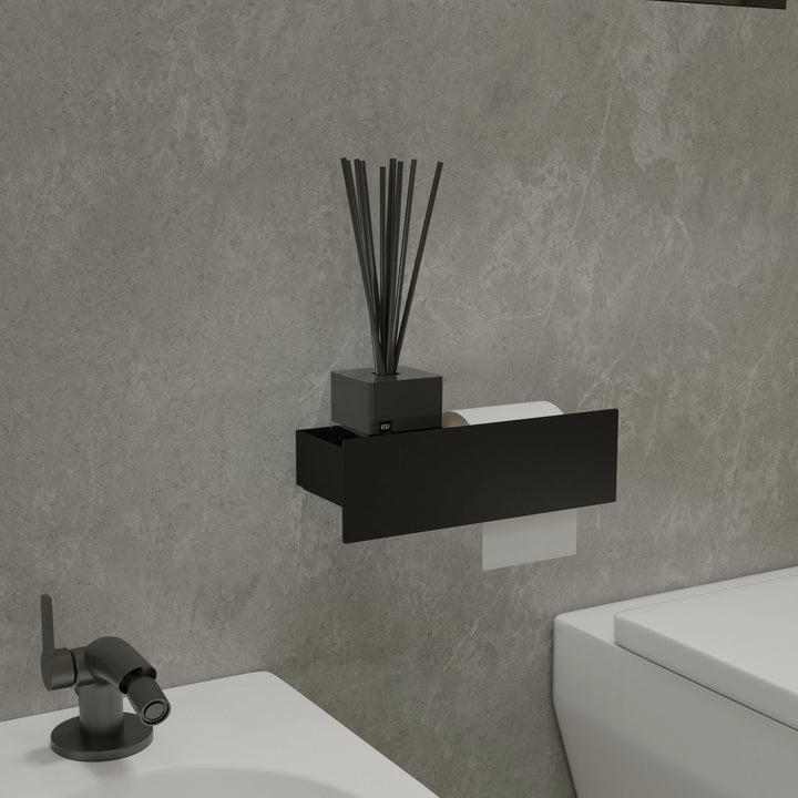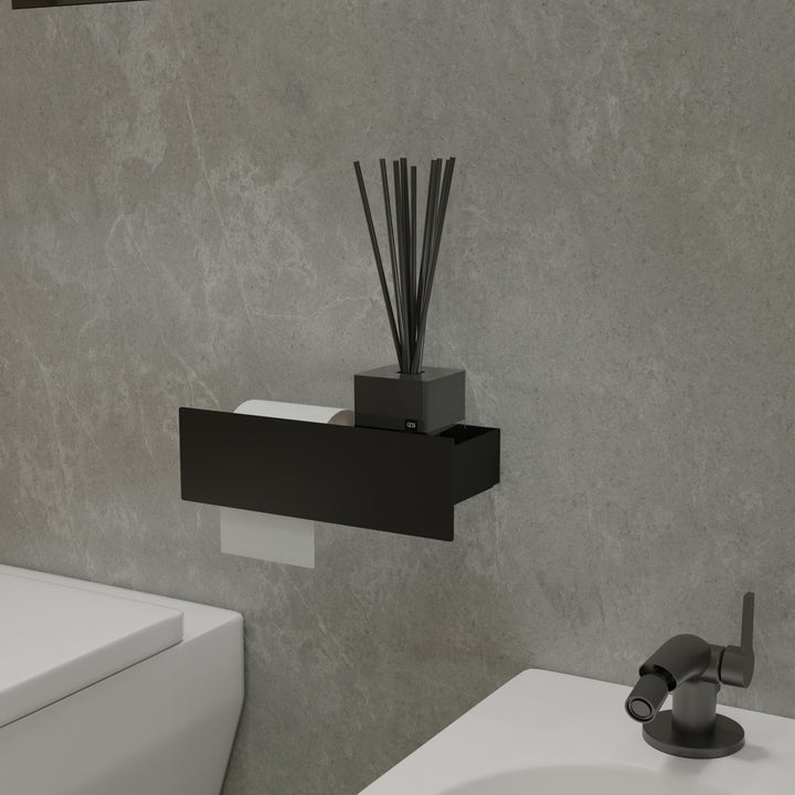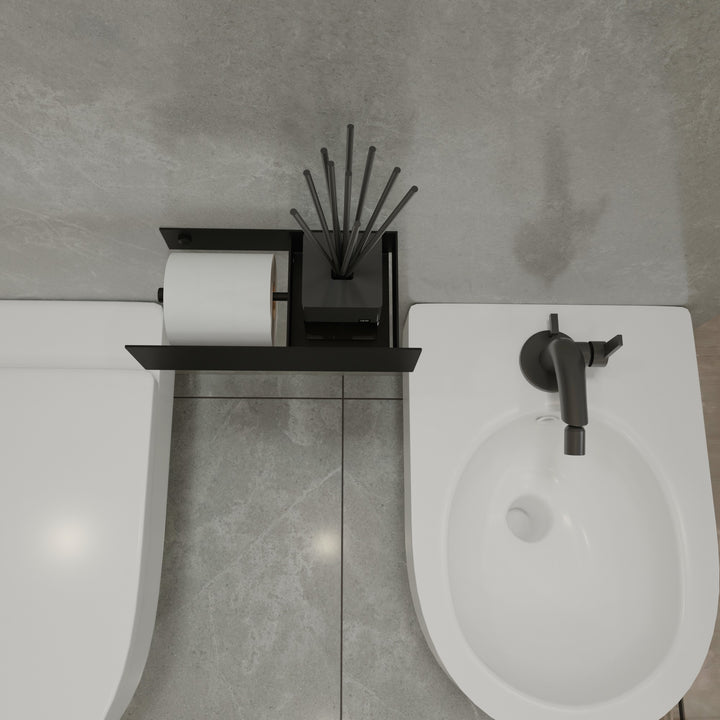 Renueva tu baño con este innovador portarrollos de papel higiénico con estante integrado. Combinando practicidad y diseño moderno, este accesorio ofrece un práctico lugar para guardar lo esencial y mantener el papel higiénico a mano.